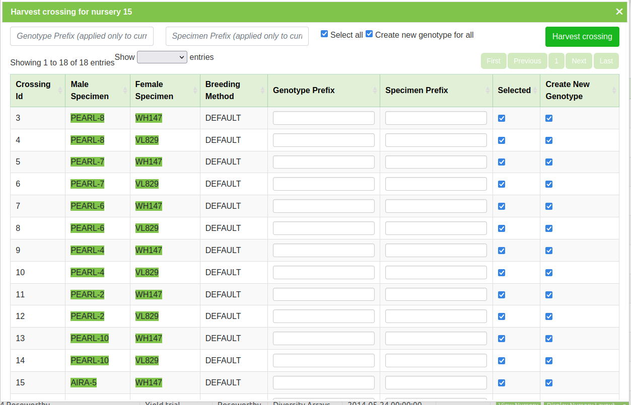 Once a nursery has a layout and a crossing set up, users can harvest from crossing and create new genotype and specimens, with appropriate pedigree entries.