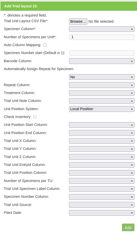 | Barcode Column | Barcode column in the input file. If this is left blank and a barcode configuration has been created for trial units, a barcode will be automatically generated. | |