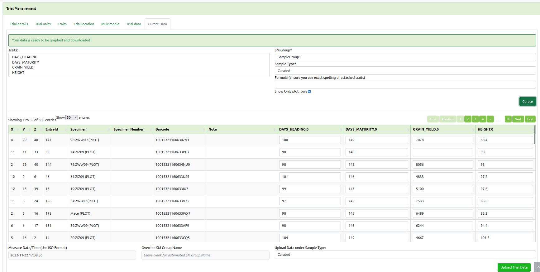 When a trial is selected from the Trials Page, it will be displayed in a Trial View Page (see the image below). The Trial View Page provides all details and data of the selected trial including trial units, trial location, traits, etc. There are also tools available such as data curation.
