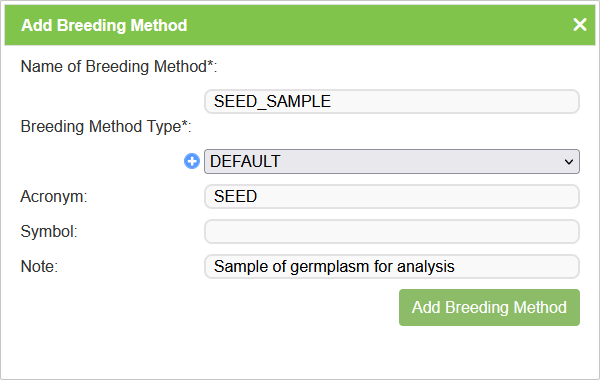| Breeding Method Type | Mandatory | Type of breeding method. A new breeding method type can be created by selecting the Add Button. |