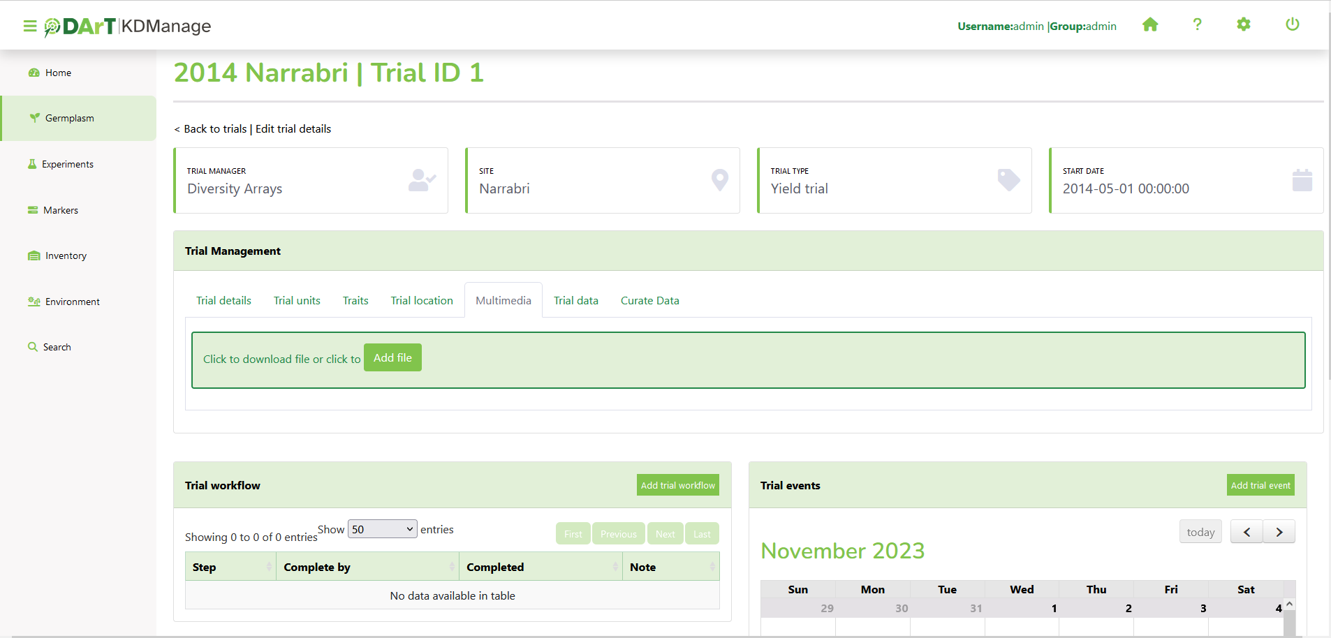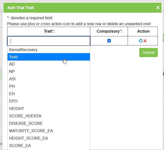 Trial traits can be added and viewed on the Trial Trait Tab.