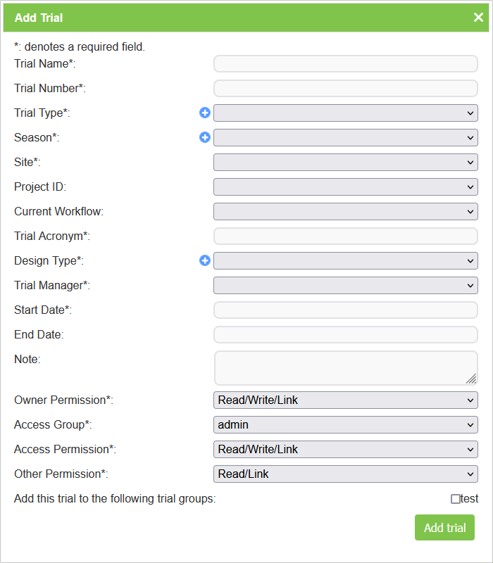 | Trial Type | Mandatory | Select from the list of trial types (A general type as opposed to design type which is a trial specific definition). |