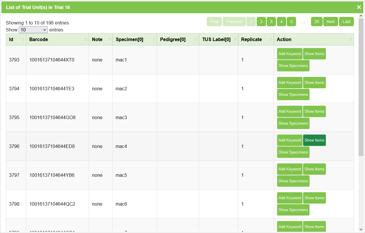 | Print Nursery Unit Barcode | Export barcodes for nursery trials for printing. | |