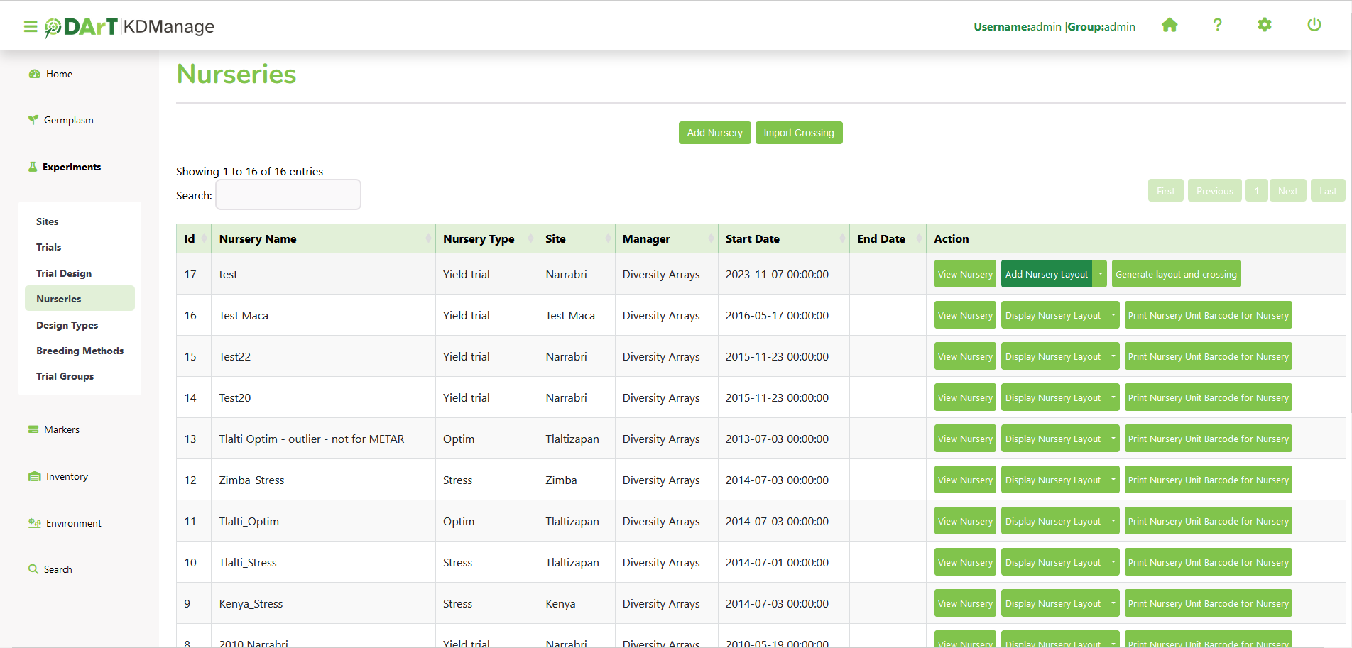 The Nurseries Page lists defined nurseries which the user/group has permission to view, as shown in the following image: