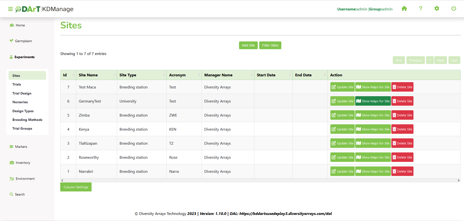 Sites are high-level groupings of trials which may equate to places where breeding/variety evaluation occurs such as a breeding station. Geographic coordinates can be assigned to enable illustration on a map. A site may consist of a whole farm, breeding station or any other general environmentally homogeneous area, where planting occurs.