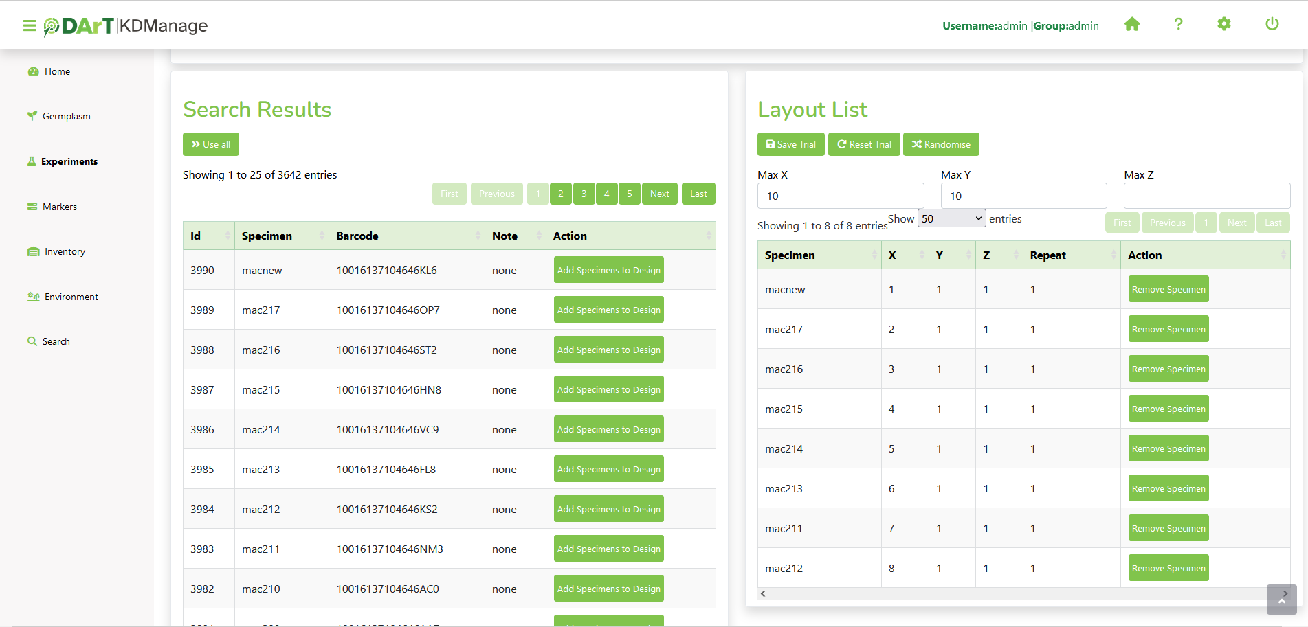 The trial design page allows data visualisation (e.g specimens) with XYZ dimensions.
