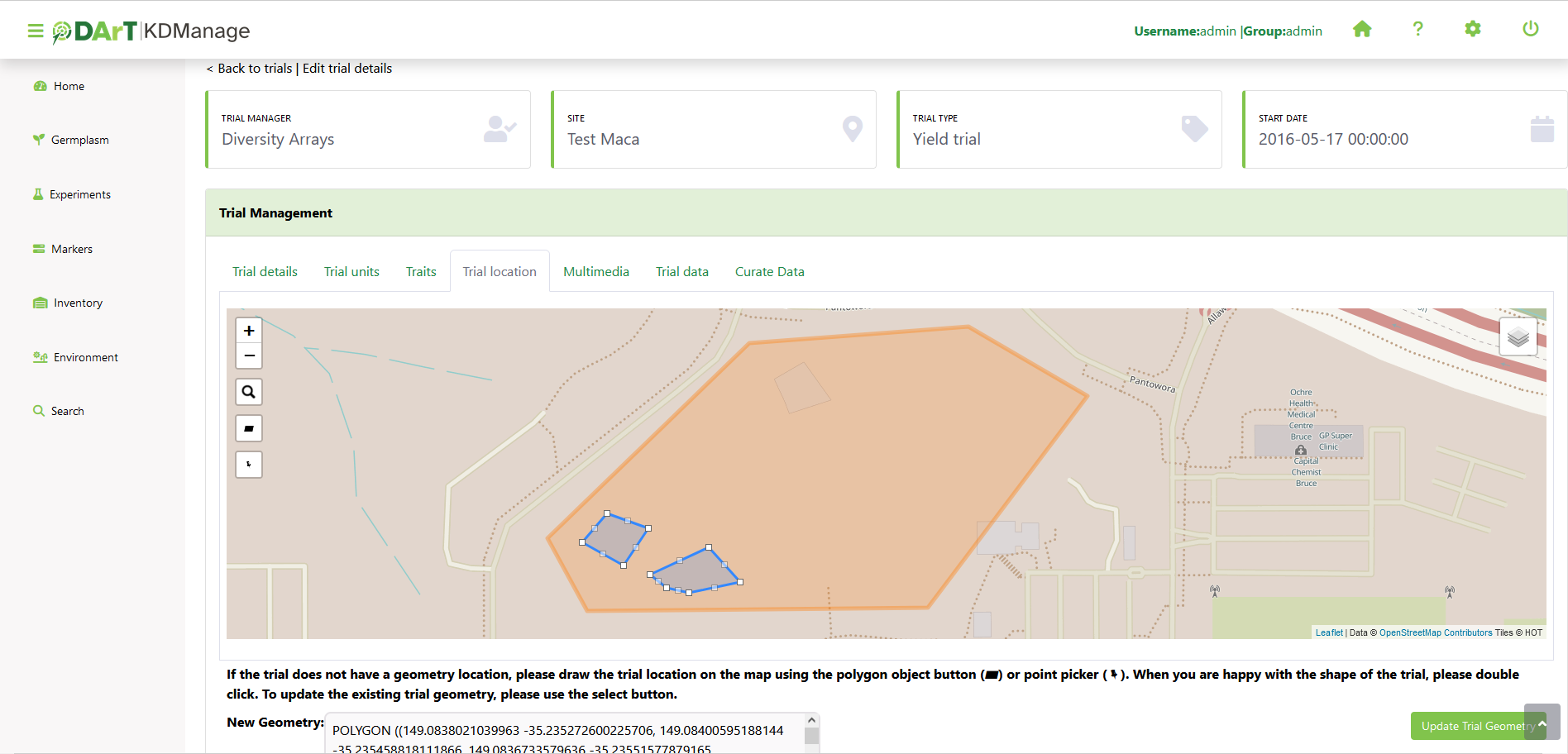 Before a trial can be added, the site to be used must exist. When defining the trial Location, the trial must be contained within the boundaries defined for the Site.
