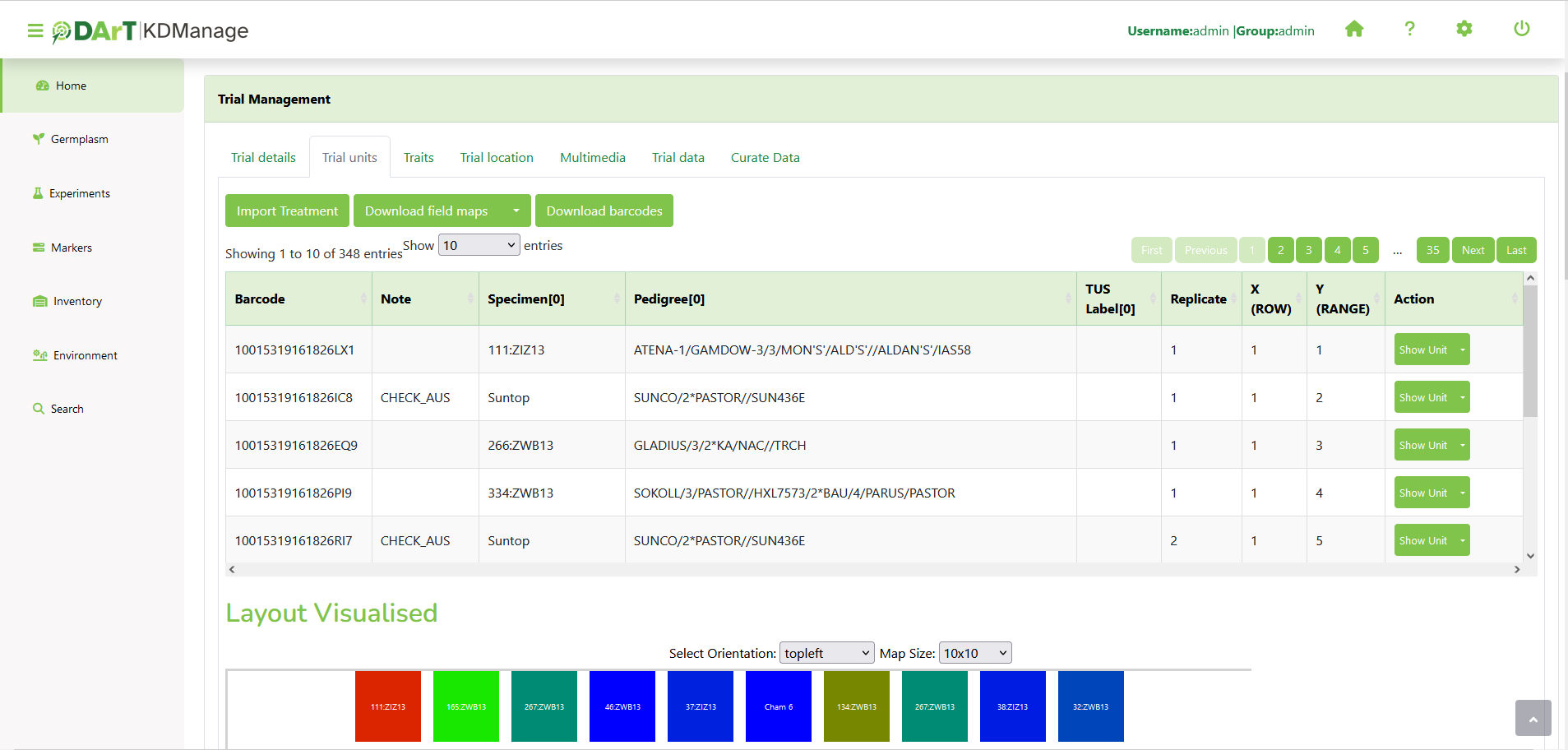 After a trial unit layout is added, users may view the table of trial units.