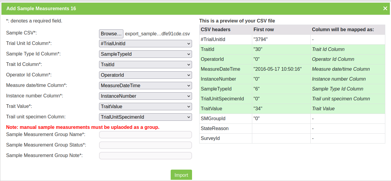 Prerequisite: Before the Trial Super Import can be used, a .csv file containing the relevant data must be prepared. This .csv should contain the columns listed within the Trial Super Import form.